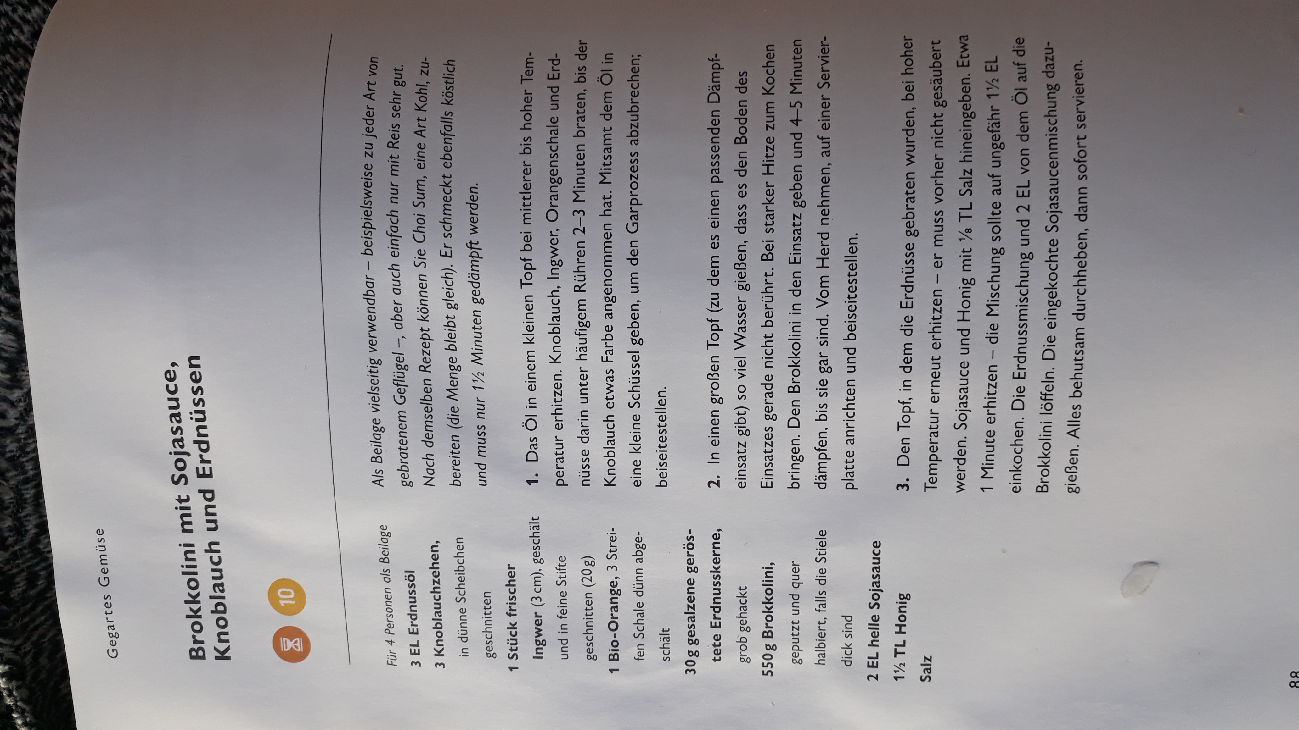 Orangenstreifen, Ingwer und Knobi zuerst in dem Erdnussöl anbraten, muss nicht schwimmend sein, dann in dem Topf die Sojasauce mit dm Honig reduzieren, das Ganze dan ruhig vermengen, aber die Erdnüsse hinterher getrennt einfach auf das Gericht streuen – schmeckt besser!